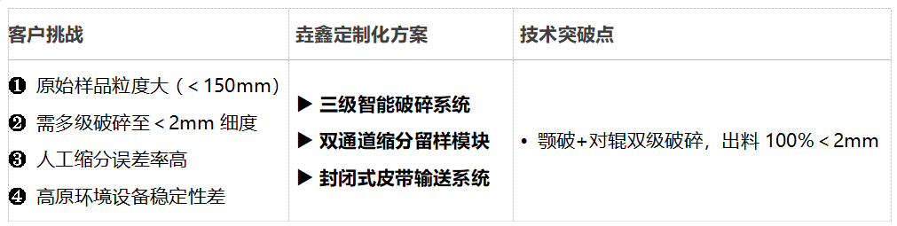 2025年4月,青岛垚鑫智能科技有限公司为青海某地质勘探重点单位交付两套模块化联合制样机,专为高原地区小批量地质样品(单样约5kg)定制。客户需实现全封闭自动化制样,满足进料<150mm地矿样本的精密处理要求,最终出料细度<2mm,同步完成检测样/留样双通道制备。